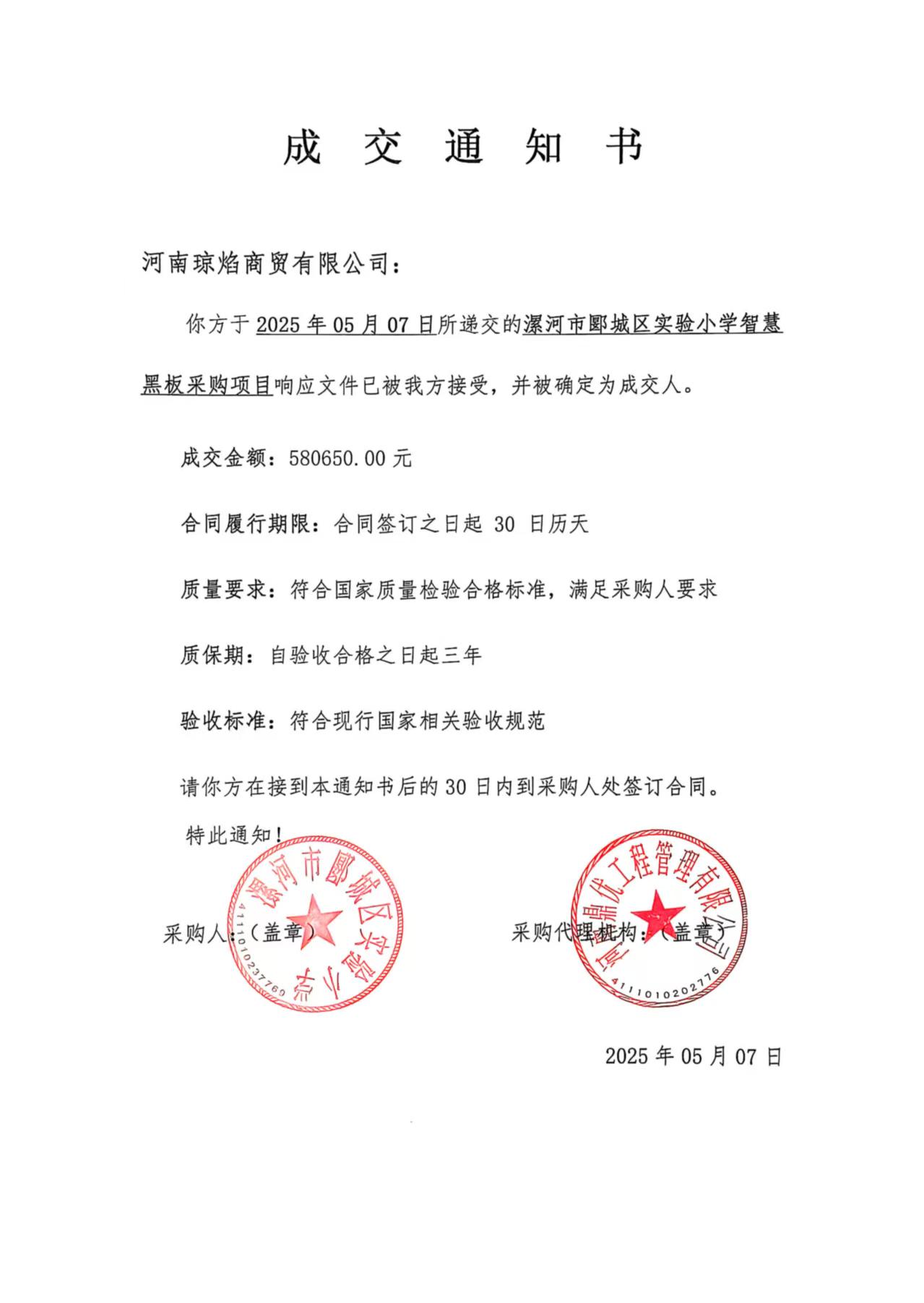 漯河市郾城区实验小学智慧黑板采购项目-合同公告